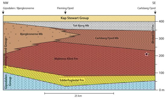 The Fleming Group consists of three formations, a lowermost Edderfugledal Formation, a middle Malmros Klint Formation, and an uppermost Ørsted Dal Formations [28]. The Edderfugledal and Malmros Klint formations formed in shallow lacustrine/playa lake environments, whereas a large part of the Ørsted Dal Formation records lake and mudflat deposition [25]. The Malmros Klint Formation is exposed in impressive cliff exposures at Carlsberg Fjord near the eastern margin of the basin, where it has a typical thickness of about 125 m (Figure 2).