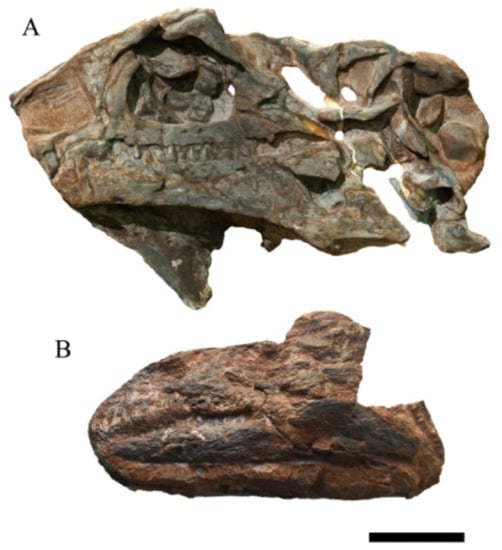 Photograph of the skulls NHMD 164741 and NHMD 164758. (A) NHMD 164741 in left lateral view. (B) NHMD 164758 in left lateral view.