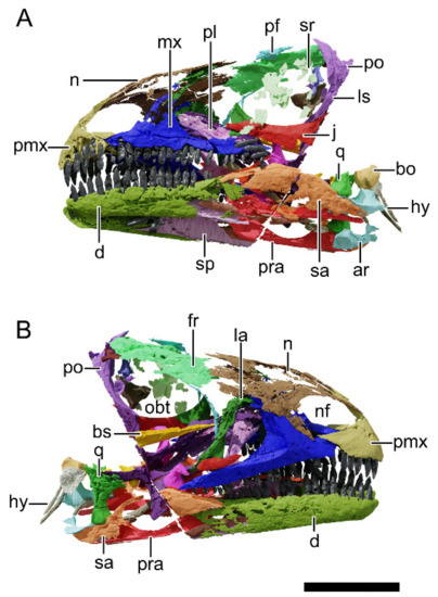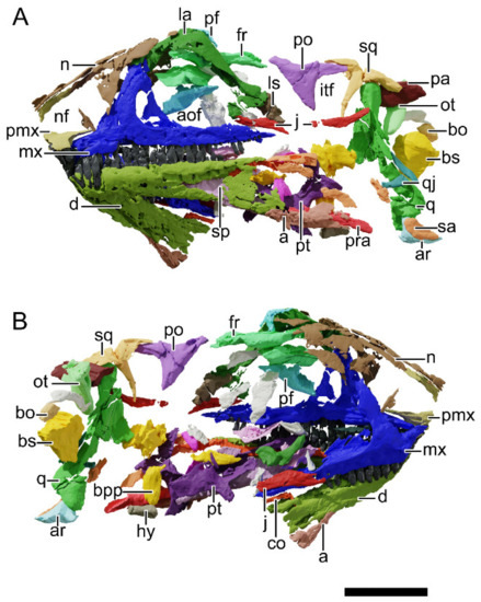 Digital reconstruction of the skull of NHMD 164741. (A) Left lateral view. (B) Right lateral view. Abbreviations: a, angular; aof, antorbital fenestra; ar, articular; bo, basioccipital; bpp, basipterygoid process; bs, basisphenoid; co, coronoid; d, dentary; fr, frontal; hy, hyoid; itf, infratemporal fenestra; j, jugal; la, lacrimal; ls, laterosphenoid; mx, maxilla; n, nasal; nf, narial fenestra; ot, otoccipital; pa, parietal; pf, prefrontal; pmx, premaxilla; po, postorbital; pra, prearticular; pt, pterygoid; q, quadrate; qj, quadratojugal; sa, surangular; sp, splenial; sq, squamosal. Scale bar = 50 mm.