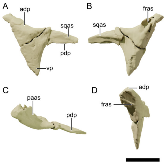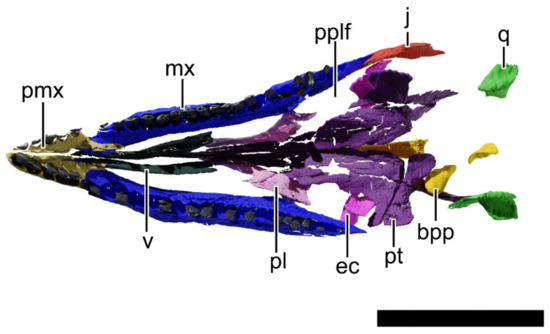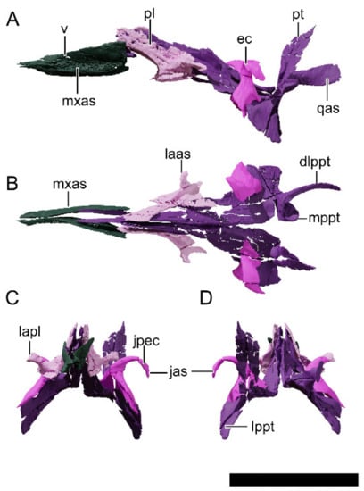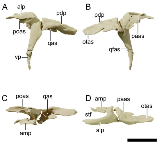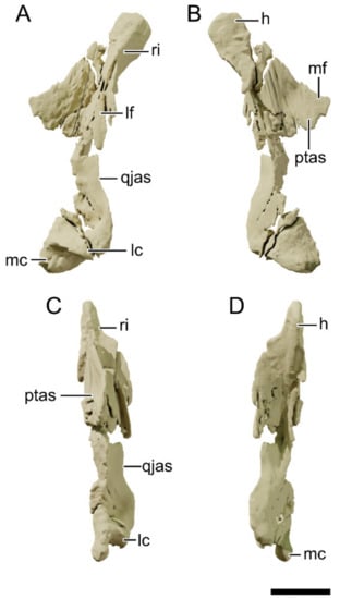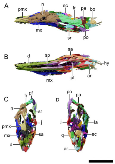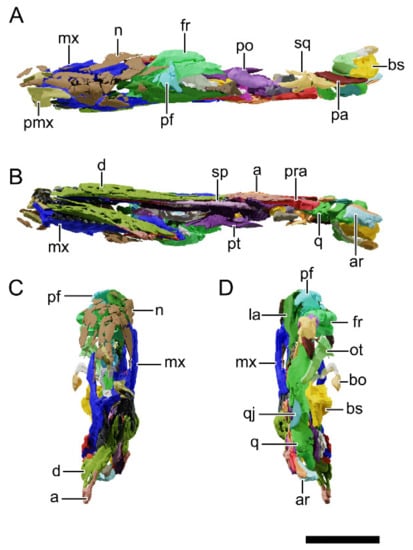 Digital reconstruction of the skull of NHMD 164741. (A) Dorsal view. (B) Ventral view. (C) Anterior view. (D) Posterior view. Abbreviations: a, angular; ar, articular; bo, basioccipital; bs, basisphenoid; d, dentary; fr, frontal; la, lacrimal; ls, laterosphenoid; mx, maxilla; n, nasal; ot, otoccipital; pa, parietal; pf, prefrontal; pmx, premaxilla; po, postorbital; pra, prearticular; pt, pterygoid; q, quadrate; qj, quadratojugal; sa, surangular; sp, splenial; sq, squamosal. Scale bar = 50 mm.