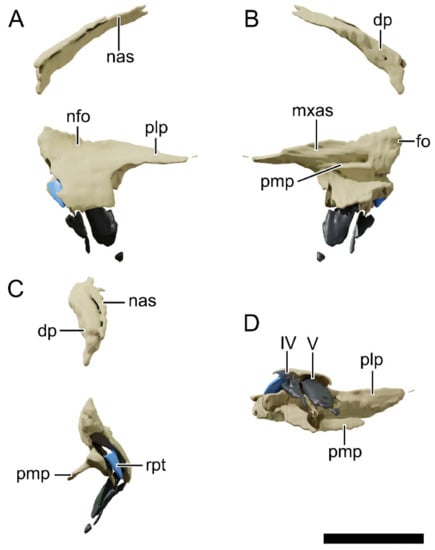 Digital reconstruction of the left premaxilla of NHMD 164741. (A) Lateral view. (B) Medial view. (C) Anterior view. (D) Ventral view. Abbreviations: dp, dorsal process; fo, foramen; mxas, articular surface for the maxilla; nas, articular surface for the nasal; nfo, narial fossa; plp, posterolateral process; pmp, posteromedial process; rpt, replacement tooth. IV and V represent the tooth position. Scale bar = 20 mm.