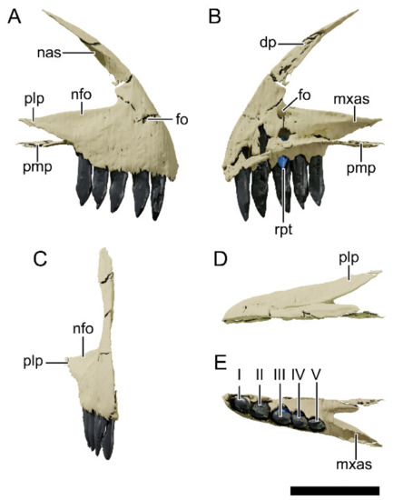 Digital reconstruction of the right premaxilla of NHMD 164758. (A) Lateral view. (B) Medial view. (C) Anterior view. (D) Dorsal view. (E) Ventral view. Abbreviations: dp, dorsal process; fo, foramen; mxas, articular surface for the maxilla; nas, articular surface for the nasal; nfo, narial fossa; plp, posterolateral process; pmp, posteromedial process; rpt, replacement tooth. I to V represent the tooth position. Scale bar = 20 mm.