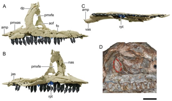 Digital reconstruction of the left maxilla of NHMD 164741. (A) Lateral view. (B) Medial view. (C) Ventral view. (D) Photograph of the left maxilla highlighting the promaxillary fenestra. Abbreviations: amp, anteromedial process; aof, antorbital fossa; dp, dorsal process; fo, foramen; jas, articular surface for the jugal; nas, articular surface for the nasal; pmxas, articular surface for the premaxilla; pmxfe, promaxillary fenestra; rpt, replacement tooth; vas, articular surface for the vomer. Scale bar = 20 mm.