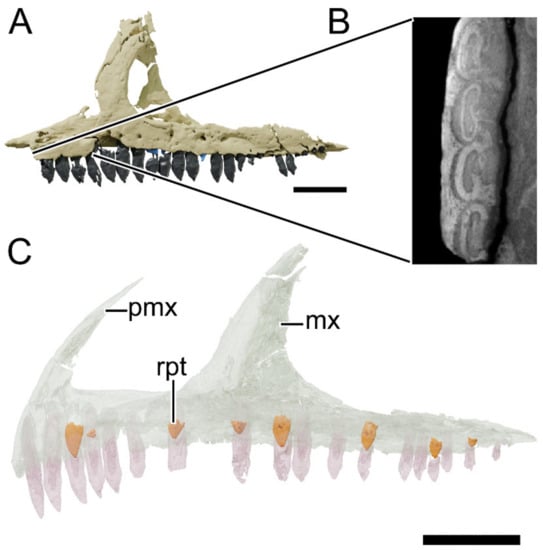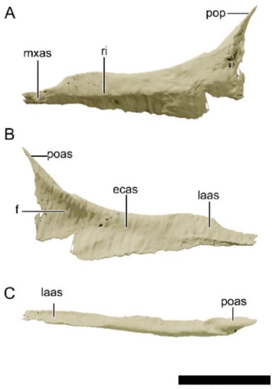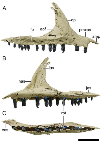Digital reconstruction of the right maxilla of NHMD 164758. (A) Lateral view. (B) Medial view. (C) Ventral view. Abbreviations: amp, anteromedial process; aof, antorbital fossa; dp, dorsal process; fo, foramen; jas, articular surface for the jugal; las, articular surface for the lacrimal; nas, articular surface for the nasal; pmxas, articular surface for the premaxilla; rpt, replacement tooth; vas, articular surface for the vomer. Scale bar = 20 mm.