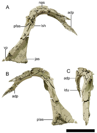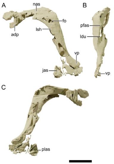 Digital reconstruction of the left lacrimal of NHMD 164741. (A) Lateral view. (B) Posterior view. (C) Medial view. Abbreviations: adp, anterodorsal process; fo, foramen; jas, articular surface for the jugal; ldu, lacrimal duct; lsh, lateral sheet of bone; nas, articular surface for the nasal; pfas, articular surface for the prefrontal; plas, articular surface for the palatine; vp, ventral process. Scale bar = 20 mm.