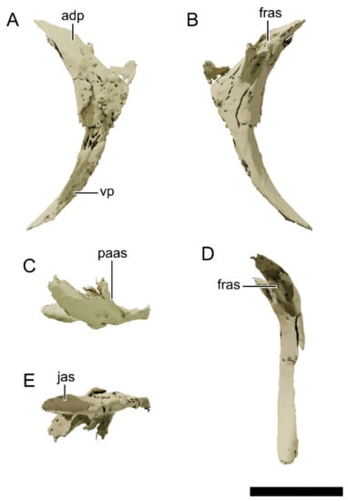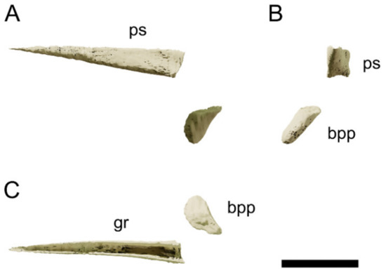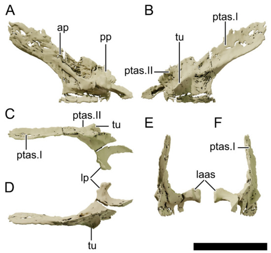 All meshes were treated and rendered with the free open-source software Blender v2.92. The segmented meshes were smoothed using the Smooth Laplacian modifier with Lambda factor = 1 and 5 repeats and then decimated to 20% of the original face count for rendering purposes. All the meshes (in .obj file format) are available at MorphoSource (ark:/87602/m4/393381, accessed on 29 September 2021). The measurements were taken both on the physical specimens and digitally in Blender. All renders were done using Cycles as a render engine and with an accurate scale bar in the software. All pictures and renders of the specimens were handled in the commercial imaging softwares Adobe Lightroom 2021 and Adobe Photoshop CC 2021 (Adobe, Mountain View, CA, USA).