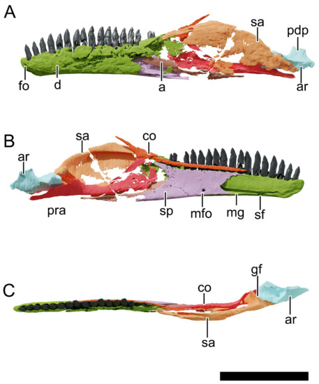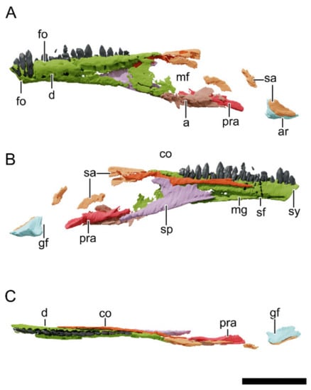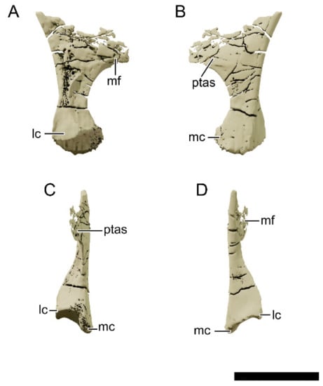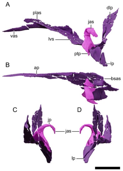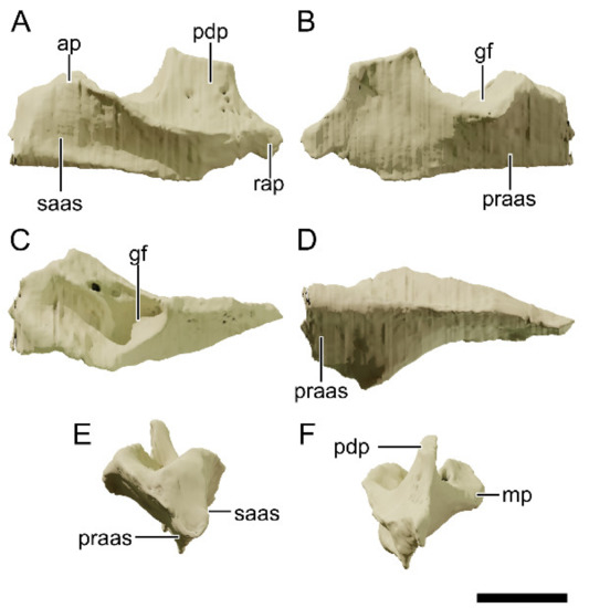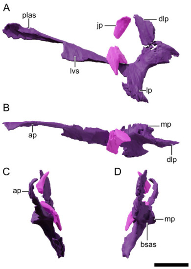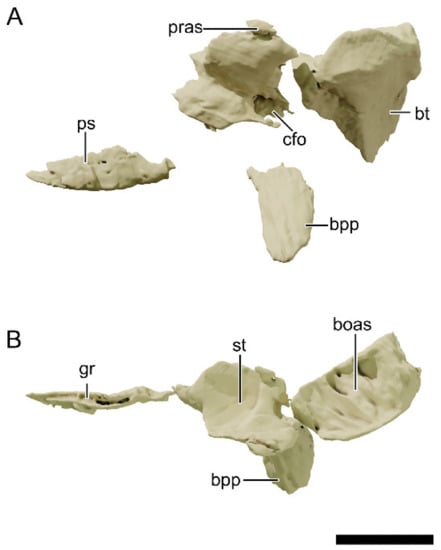 - Chapelle, K.E.J.; Choiniere, J.N. A revised cranial description of Massospondylus Carinatus owen (Dinosauria: Sauropodomorpha) based on computed tomographic scans and a review of cranial characters for basal Sauropodomorpha. PeerJ 2018, 6, e4224. [Google Scholar] [CrossRef] [PubMed] [Green Version]
