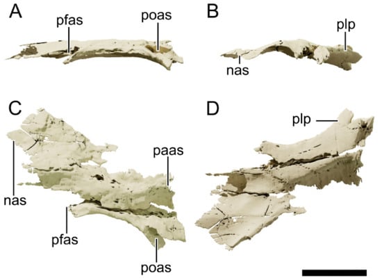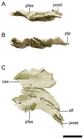 The nasals are dorsoventrally thin tetraradiate bones (Figure 3, Figure 4, Figure 5, Figure 6 and Figure 7), anteroposteriorly longer than lateromedially wide. The nasal is relatively shorter in NHMD 164741 and NHMD 164758 than in Plateosaurus. In Plateosaurus, the nasal is longer than half the skull roof length, a distinctive feature for the genus [52,53,63]. The main body of the nasal is dorsally convex and overlaps laterally the apex of the maxillary dorsal process. At its posterior region, the nasal contacts the prefrontal laterally and the frontal ventrally. Anteriorly, the nasal radiates in two ventrally oriented processes, separated by a dorsal concavity of the nasal. This area encompasses the posterodorsal region of the narial fenestra. The anteromedial (=premaxillary) process of the nasal contacts the dorsal process of the premaxilla laterally. The lateroventral (=maxillary) process marginates the dorsal process of the maxilla as a ventrally oriented triangular blade. Ventrally, this process tapers to a point that finishes just before contacting the posteriormost tip of the posterolateral process. A point-contact between the distal part of the lateroventral process of the nasal and the posterolateral process of the premaxilla is observed in Plateosaurus but not in Mac. itaquii and Mas. carinatus.