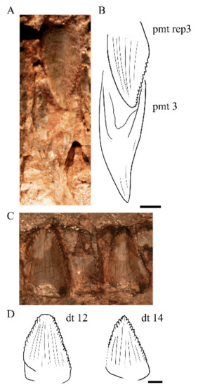 NHMD 164741 preserves the posterior half of the left premaxilla (Figure 8). NHMD 164758 bears the only complete premaxilla of both specimens (right element, Figure 9). The premaxilla is triangular in lateral profile, encompassing most of the narial fenestra. The main body of the premaxilla is slightly anteroposteriorly longer than dorsoventrally tall and contains five alveoli, the first of which is adjacent to the rostral tip of the bone. A 5-tooth premaxilla is also seen in Plateosaurus (except for specimens with 6 premaxillary teeth, i.e., HMN XXIV, SMNS 12949 and SMNS 13200), and the position of the first premaxillary tooth is close to the anterior margin of the premaxilla. An anteriorly located first premaxillary tooth is similar to that of the juvenile Pl. trossingensis (MSF 15.8B) and is thought to be related to ontogeny [53], as in mature specimens of Pl. trossingensis (i.e., MSF 11.4, MSF 15.8, and 16.1) there is usually a gap between the anterior tip of the premaxilla and the first premaxillary tooth.
