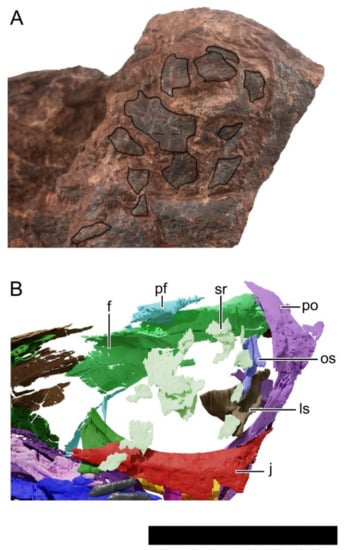 Digital reconstruction of the skull of NHMD 164758. (A) Left lateral view. (B) Right lateral view. Abbreviations: ar, articular; bo, basioccipital; bs, basisphenoid; d, dentary; fr, frontal; hy, hyoid; j, jugal; la, lacrimal; ls, laterosphenoid; mx, maxilla; n, nasal; nf, narial fenestra; obt, orbit; pf, prefrontal; pl, palatine; pmx, premaxilla; po, postorbital; pra, prearticular; pt, pterygoid; q, quadrate; sa, surangular; sp, splenial; sr, sclerotic ring. Scale bar = 50 mm.