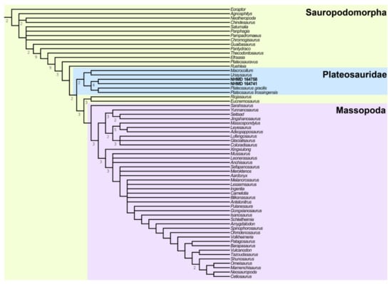 The specimens NHMD 164741 and NHMD 164758 were scored separately in the data matrix of Rauhut et al. [12], containing 67 OTUs and 382 characters (120 cranial and 262 post-cranial) (Supplementary Materials, Data S1). Mac. itaquii was scored in this dataset, following the descriptive work of Müller et al. [22] and Müller [19] to assess the validity of the clade Unaysauridae and its relationship to Plateosauridae. The phylogenetic analysis was conducted using the free software TNT v1.5 [56]. The trees were recovered using Traditional Search, with 1000 Wagner trees replicates, holding 20 trees per replicate, with TBR algorithm and 1 random seed, collapsing the trees after the search. Consistency and retention indexes and Bremer Support were obtained using a premade script. Bootstrap was calculated using absolute frequencies and 100 replicates. All characters were treated with the same weight, and characters 8, 13, 19, 23, 40, 57, 62, 69, 92, 102, 117, 121, 122, 129, 132, 148, 150, 151, 158, 168, 170, 171, 178, 210, 211, 213, 232, 237, 254, 263, 268, 282, 295, 316, 322, 330, 352, 365, 368, 370, 375, and 380 were treated as ordered.