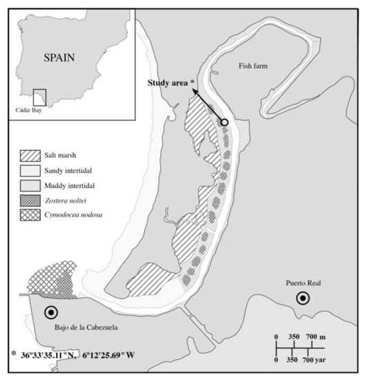 Los Toruños salt marsh is a sea arm at Cádiz Bay Natural Park (36°33′35.11″ N, 6°12′25.69″ W, Figure 1), where mono-specific as well as mixed meadows of the seagrasses Zostera noltei and Cymodocea nodosa occur in intertidal areas at mean depths between 1 and 1.5 m (relative to mean high water level, MHWL [49]). While mixed meadows usually thrive at the sandy mouth of this sea arm, the muddy edges of the channel are colonized by mono-specific Z. noltei stands either in a continuous or a patchy distribution [49]. During ebb and flow tides, there is a strong unidirectional flow parallel to the shoreline, reaching high flow velocities and turbulence levels (up to 75 cm s−1) that completely mix the water body [50]. The sediment is muddy with a high organic matter content, which promotes anoxic conditions and low redox potentials at the sediment surface, with Eh values from −122 mV to −28.3 mV [51].