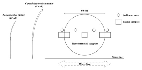 Seagrasses constitute a reduced group of vascular plants that successfully colonized coastal areas through different morphological, physiological, and ecological adaptations allowing for overcoming most of the constraints imposed by the marine environment (e.g., salinity, tides, hydrodynamics, etc.). As a main outcome for such adaptations, most of the seagrass species show an adaptive convergence for morphological (e.g., very flexible aboveground structures and buried rhizomes and roots) and/or ecological traits (e.g., hydrophilic pollination and clonal growth) [12,13]. Seagrasses can occur either as large meadows or as scattered patches along the shore. However, regardless of the spatial pattern, the structural complexity of these habitats, both above and below the sediment surface, is higher than that in neighboring bare areas [14]. Seagrass canopy (i.e., aboveground structures) creates a boundary contrast with the surrounding unvegetated areas [15], which modifies the strength of both top-down and bottom-up processes [16]. Among the most widely studied biotic (i.e., top-down) mechanisms positively affecting the seagrass-inhabiting fauna are (1) the reduction in the strength of the predation intensity; (2) the creation of new habitats and niches, and (3) the reduction in the bioturbation activity of some organisms [5,6,17]. Within the abiotic (i.e., bottom-up), hydrodynamics is probably among the most important variables. In fact, the flexible aboveground biomass (AG) allows plants to reduce the drag force they support by bending in the same direction as the water flow [18,19], reducing the flow velocity throughout the canopy [20] and creating more favorable environmental conditions for fauna development [21,22,23,24,25,26].