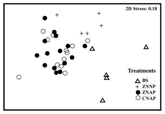A multidimensional scaling MDS [66,67], ANOSIM [68], and permutational multivariate analyses of variance (PERMANOVA [69,70]) were applied to identify community similarities between treatments. After four-root transformation, a Bray–Curtis resemblance matrix was obtained from an abundance benthic data matrix. Additionally, the taxa contributing to dissimilarities observed were checked by the SIMPER analysis [71]. The multivariate analysis was developed using PRIMER (Plymouth Routines In Multivariate Ecological Research, 6.1.13 software [72]).