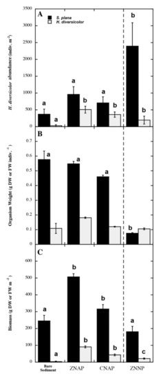Contrastingly, H. diversicolor seemed to feed from all available food sources in a quite variable proportion, although Z. noltei leaves were the source more consumed in all of the treatments (Table 3). However, the results derived from MixSIAR should be interpreted with caution, since a potential food source might be not considered as indicated by the model. The isotopic niche and overlap estimated from isotopic data by SIBER showed that, in both species, the largest niche width was observed in ZNAP. Otherwise, SIBER overlap was significant between ZNAP and CNAP for H. diversicolor. A considerable overlap was also estimated between ZNAP and CNAP, and between ZNAP and ZNNP for S. plana (Figure 8 A,B, and Table 4).