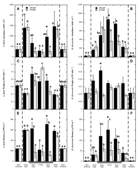 Abundance and total biomass of H. diversicolor increased centripetally in both types of artificial patches (Figure 6B,D), although only spatial significant differences were found for ZNAP. The effects on abundance might be partially attributed to an enhanced protection against predation, in comparison with BS, since this species is highly predated by fishes and shore birds [88,89]. However, a lower predation pressure cannot totally explain the preferential accumulation of H. diversicolor at the outer edge of the patches, where it does not obtain any protection against predation. In addition, differences between both types of artificial patches were also found, in spite of their similar above and belowground complexity (i.e., architectural attributes), which may render a similar predation effectiveness of predator species [90]. It is known that H. diversicolor is highly predated by different species and that it has a large plasticity in feeding behavior [61,91]. This feeding plasticity allows H. diversicolor to occur in a variety of habitats [88]. The isotope composition (Figure 8; Table 3 and Table 4) confirmed this point, showing that (1) H. diversicolor fed from all the potential sources studied and (2) the contribution of the different sources shifted depending on the habitat (mainly BS versus artificial patches—ZNAP and CNAP—and ZNNP). This might indicate that food availability (quantity and/or quality) depended highly on the type of habitat. It is important to note the large contribution of Z. noltei leaves to the diet of H. diversicolor (Table 3), which agrees with previous findings of a direct assimilation of plant detritus by this species [61] and with field observations where individuals of H. diversicolor were observed feeding directly over seagrass leaves [Brun, personal observations]. Therefore, changes in food availability could partially explain the distribution pattern of H. diversicolor within the artificial patches. However, our experimental set-up did not allow us to reach further conclusions; additional experimentation is required to determine the strength of different processes affecting its distribution within patches.