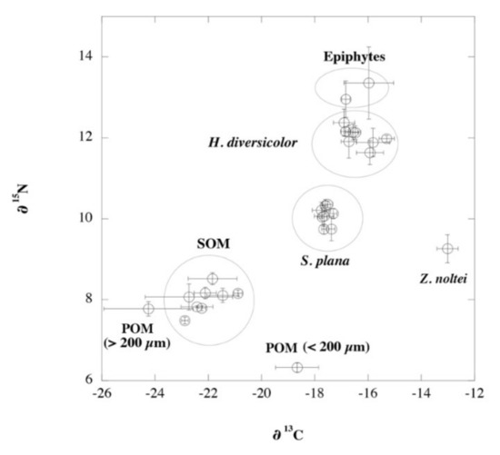 Samples were analyzed in an elemental analyzer coupled with an isotope ratio mass spectrometer (Europa Hydra IRMS coupled to a Carlo Erba NC250) for the determination of nitrogen and carbon content (% DW), and stable isotopes. Stable isotope ratios were converted to ‰ notation using Peedee Belamite (PDB) and air-N2 as standards for C and N, respectively. The stable isotope ratio in the tissues of organisms (Scrobicularia plana and Hediste diversicolor) is directly related to its diet (e.g., potential food sources such as POM, SOM, epiphytes, and Zostera noltei leaves [60,61]). As the number of potential food sources exceeded the number of isotopes analyzed plus 1 (2 isotopes), a Bayesian mixing model (v4.0.3) (MixSIAR [62]) was applied to estimate the contribution of the different sources to diet, employing trophic enrichment factors previously used for H. diversicolor and S. plana13C = 0.30 ± 0.21 and Δ15N = 2.5 ± 0.05) [63]. Since epiphytes from artificial patches of Z. noltei and C. nodosa were only available under such treatments, these food sources were only utilized in ZNAP and CNAP treatments. The isotopic niche width for each treatment in both species was estimated using stable isotope Bayesian ellipses in R (SIBER [64]), which generates standard ellipse corrected areas (SEAc, containing 40% of the data) in a δ 13C-δ 15N bi-plot space. SEAc overlap between treatments was calculated as the proportion of the non-overlapping area (total overlap area divided by the sum of the areas of two ellipses minus the total overlap area). SEAc overlap values ≥ 60% were considered biologically significant [65].