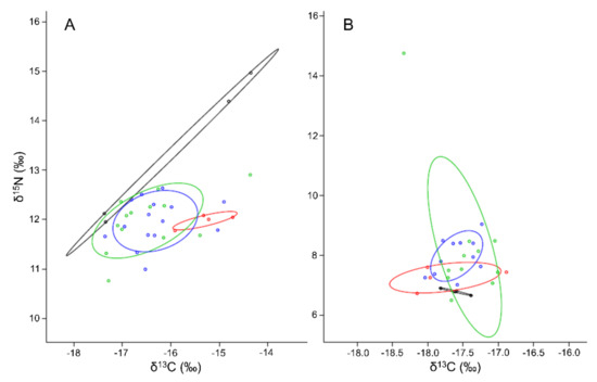 3.5. Deriving Diet Shifts from Stable Isotopes