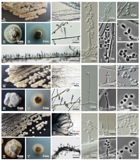 Acrodontium crateriforme has been reported as a cosmopolitan species from invertebrate animals, fungi, humans, and plant tissues [47,48]. Koukol [50] highlighted that repeated isolation of A. crateriforme from invertebrates and fungi indicates a preference for more nitrogen-rich substrates. The author also pointed out that conidial size variations among strains obtained in previous studies [47,48,50]. In the present study, three isolates of this complex mentioned below were obtained from three different samples, and these isolates showed genetic and morphological variations (Figure 2M–AF and Figure 5). Further analysis based on additional gene regions, such as rpb2 or β-tubulin [47], and the further discovery of additional strains will elucidate the diversity of their host preferences or their phylogenetic complexity.