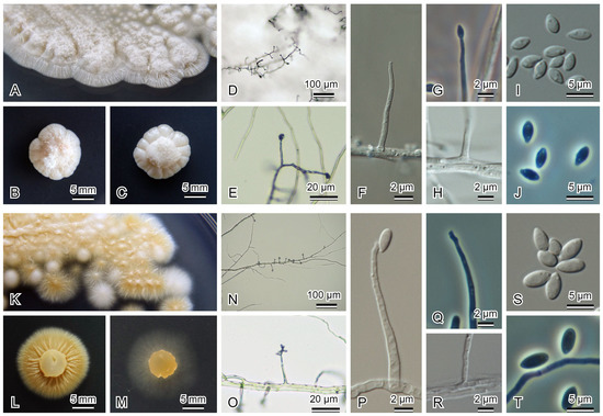 Acremoniunm sp. and “Acrodontium” cf. salmoneum. (A–J) Acremonium sp. (A,B from JCM 39226, C from JCM 39227, D–J from JCM 39225). (A–C) Colonies on PDA after 10 days at 28 °C. (D,E) Conidiogenous cells on hyphae. (F–H) Conidiogenous cells. (I,J) Conidia. (K–T) “Acrodontium” cf. salmoneum (JCM 39229). (K,L) Colonies on PDA after 8 days at 20 °C. (M) Colonies on MEA after 8 days at 20 °C. (N,O) Conidiogenous cells on hyphae. (P–R) Conidiogenous cells. (S,T) Conidia.