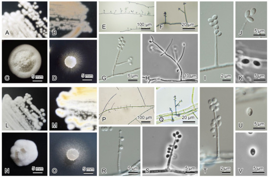 Simpllicillium species. (A–K) Simpllicillium sp. 1 aff. sympodiophorum (JCM 39230). (A–C) Colonies on PDA after 7 days at 25 °C. (D) Colonies on MEA after 7 days at 25 °C. (E–I) Conidiogenous cells. (J,K) Conidia. (L–V) Simpllicillium sp. 2 aff. sympodiophorum (JCM 39233). (L–N) Colonies on PDA after 7 days at 25 °C. (O) Colonies on MEA after 7 days at 25 °C. (P–T) Conidiogenous cells. (U,V) Conidia.