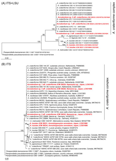 Note: In the phylogenetic tree, JCM 39228 clustered with the A. crateriforme complex (Figure 5). ITS sequences of our isolate and the ex-holotype strain of A. crateriforme (CBS 144.33; NR_152320) differed by one gap. The fungus differed from Acrodontium sp. 1 aff. crateriforme (JCM 39224) by one gap and Acrodontium sp. 2 aff. crateriforme (JCM 39232) by one nucleotide with one gap in the ITS region. We have not yet observed the morphological features in JCM 39228 very carefully, so we tentatively treated the fungus as Acrodontium sp. 3 aff. crateriforme according to the phylogenetic affinities.