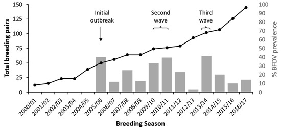 4.1. Multiple Waves of BFDV Infection Following Initial Outbreak