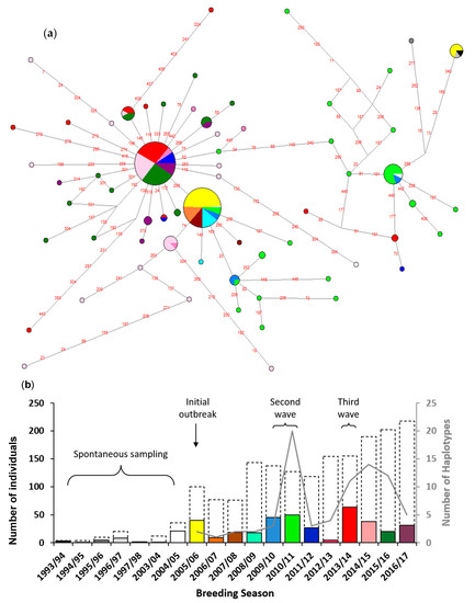 Figure 2 shows the changes in BFDV prevalence since the initial outbreak in 2005 against a backdrop of increasing numbers of host–breeding pairs as the host population has continued to recover from its initial low population size as a consequence of intensive conservation management. The changes in BFDV prevalence indicate that the parakeet host population has experienced at least two subsequent ‘waves’ of BFDV infection; in 2010/2011 (39.4% BFDV prevalence) and in 2013/2014 (41.3% BFDV prevalence) that were equal to or larger than the initial 2005 outbreak, interspersed with periods of low infection. The haplotype network shown in Figure 3 indicates at least three clusters of the most frequently occurring BFDV haplotypes (Figure 3a), with each one of the three most dominant haplotypes being those corresponding to the initial outbreak and the second and third waves of BFDV infection (Figure 3b). The starburst pattern present within the haplotype network is indicative of significant demographic expansion and diversification within the host population since 1993, and is supported by the Fu’s F test statistic [45] (−33.30, p < 0.001, k = 4.46, h = 0.85 ± 0.00, π = 0.01 ± 0.01).