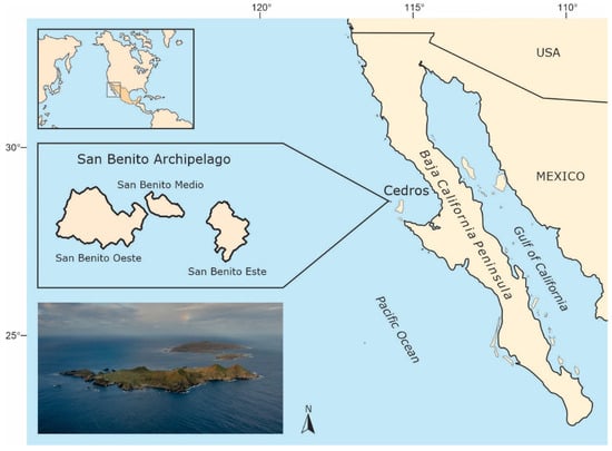 The SBA is located in the Pacific Ocean, off the central portion of the Baja California peninsula (Figure 1). It comprises three islands: SBO (400 ha); San Benito Medio (SBM, 45 ha); and San Benito Este (SBE, 146 ha). These islands are washed by the California Current System, which has significant influence on the region’s marine productivity and, thus, its seabird populations [24,25]. These islands feature remarkable biodiversity and are part of the protected area Reserva de la Biosfera Islas del Pacífico de la Península de Baja California, created in December 2016, managed by the federal government through the National Commission of Natural Protected Areas (CONANP) [22,26]. These islands are of continental origin and feature an arid climate. The dominant vegetation is maritime desert scrub [27]. They support 51 species of plants and 80 vertebrate species, including one endemic reptile (San Benito side-blotched lizard, Uta stellata), four pinnipeds (Guadalupe fur seal, Arctocephalus philippii townsendi; Northern elephant seal, Mirounga angustirostris; Harbor seal, Phoca vitulina; and California sea lion, Zalophus californianus) and 75 birds [27,28,29]. Native terrestrial mammals have never been recorded [29]. The SBA is an Important Bird Area (IBA) and is of central ecological importance for seabirds in the region [6,7,30,31,32,33,34,35]. Of all the Pacific islands off the Baja California Peninsula, the SBA has the greatest number of breeding seabirds with 13 species, and also the highest number of breeding pairs at 281,285 (CI95%: 657–634,988) on average between 2014–2019, with cassin’s auklet (Ptychoramphus aleuticus) and three storm-petrels (Leach’s storm-petrel, Hydrobates leucorhous; black storm-petrel, H. melania; and least storm-petrel H. microsoma) the most abundant species [6]. To date, the SBA remains the largest and most seabird species-diverse colony in all the US and Mexico Pacific islands [6,7].