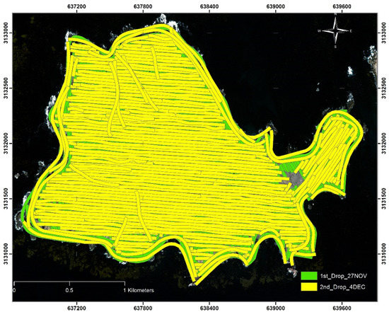 Map showing the helicopter coverage during the first (green; 27 November 2013) and second (yellow; 4 December 2013) bait drops during the mouse eradication on San Benito Oeste island. The gap shown to the east is where the fishing camp is located, which was treated by hand and bait stations after each bait drop.