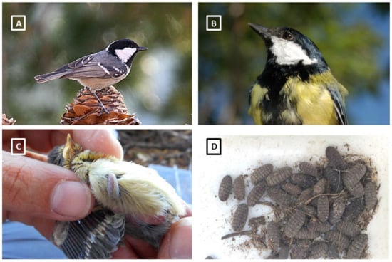 - Polo, V. Carbonero Garrapinos—Periparus ater (Linnaeus, 1758). In Enciclopedia Virtual de los Vertebrados Españoles; Salvador, A., Morales, M.B., Eds.; Museo Nacional de Ciencias Naturales: Madrid, Spain, 2016; Available online: http://www.vertebradosibericos.org (accessed on 13 May 2021).