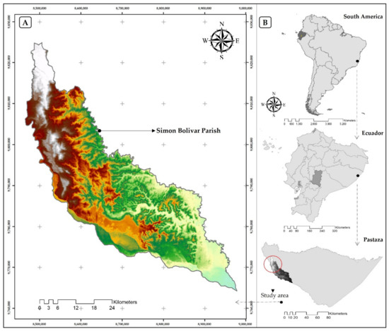 Map of the study area. (A) Simon Bolivar Parish location (B) location in relation to South America, Ecuador and Pastaza Province.