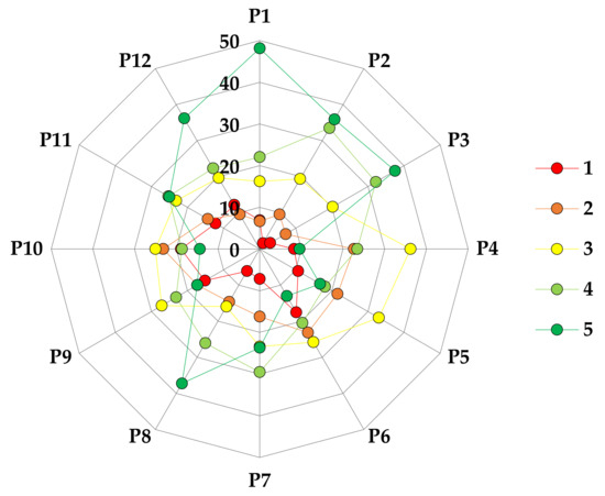 Ratings of the respondents were analyzed by the use of relative frequency of responses given on the Likert scale (1 to 5), at two levels of aggregation: The first level was that of the entire respondent cohort, for which the perceptions of the land management systems were characterized by the relative frequencies of ratings from 1 to 5 computed for the 12 pictures shown to the respondents. The second level of aggregation was that characterizing the reorganized attributes of sociodemographic data; as such, relative frequencies of each response given on the Likert scale were computed for the gender (i.e., female vs. male respondents), civil status, age, education level, ethnicity, monthly income, and occupation attributes. For both levels of data aggregation, the results were prepared in the form of radar plots.
