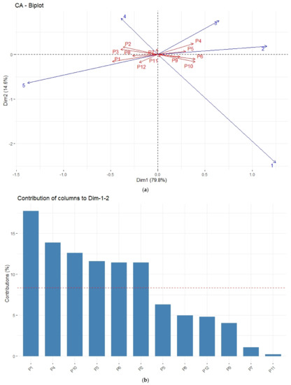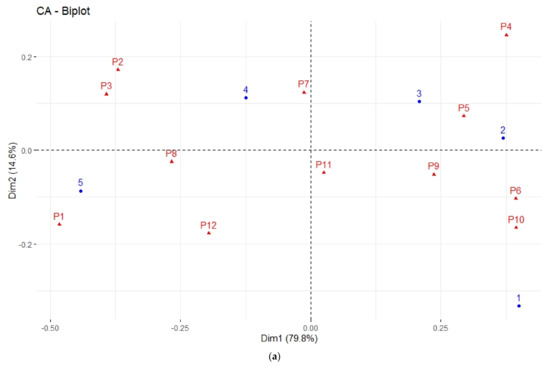 Figure 4a shows the asymmetrical biplot of the data, by plotting the row (ratings) profiles in the column space (pictures). Interpretation of data on an asymmetrical plot may be done based on the angles made by the arrows and the projection of the data characterizing a given row on the arrows depicting the column profiles [43]. For instance, if the angle between two given arrows is more acute, the association between them is stronger. As such, P1 was more associated with ratings of 5, while at the opposite end was the association between P10 and ratings of 1. Ratings of 1 and 5, and data characterizing P1, P4, P10, P3, P6, and P2, contributed the most to the first two dimensions generated by the correspondence analysis.
