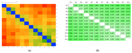 The results of the workflow implemented for the hierarchical cluster analysis are shown in Figure 5 and Figure 6. Figure 5a shows the distance map based on Spearman’s dissimilarity metric, while Figure 5b gives the actual distances computed in the range of 0 to 1. Finally, Figure 6 shows the dendrogram built via cluster analysis, in which three clusters were kept in the final solution.