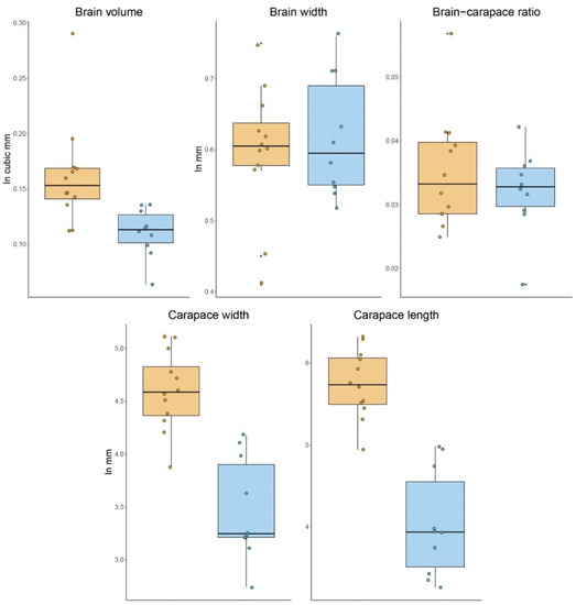 Volumetric and size comparisons. Boxplots comparing the volume and size variation in both groups. Fresh material (New) is shown in dark yellow and legacy material (Old) in blue. Note that although there is a considerable variation in absolute brain volume and carapace size, the brain width and brain–carapace ratio are not significantly different between the groups.