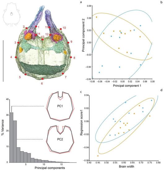 - Klingenberg, C.P. MorphoJ: An integrated software package for geometric morphometrics. Mol. Ecol. Resour. 2011, 11, 353–357. [Google Scholar] [CrossRef]