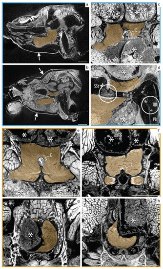 - Castejón, D.; Alba-Tercedor, J.; Rotllant, G.; Ribes, E.; Durfort, M.; Guerao, G. Micro-computed tomography and histology to explore internal morphology in decapod larvae. Sci. Rep. 2018, 8, 14399. [Google Scholar] [CrossRef] [PubMed]