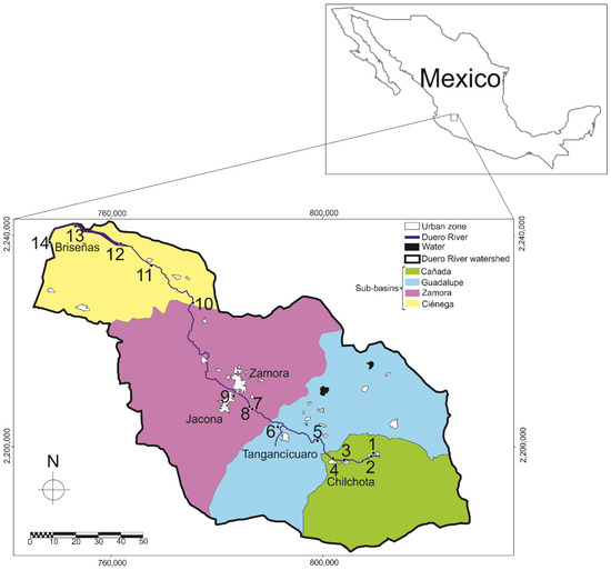 Duero River watershed with the location of the sub basins and sampling sites: (1) Kunio, (2) Tacuro, (3) La Toma, (4) El Rastro (5) Etúcuaro, (6) Camécuaro, (7) Antes Central de Abastos, (8) Después Central de Abastos, (9) Verduzco, (10) Estanzuela, (11) San Cristóbal, (12) Capulín, (13) Cumuato, and (14) Ibarra.