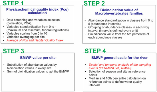 Although the BMWP has been used in different rivers in Mexico, Ruiz-Picos et al. [13] emphasize the necessity to adapt the index, not only to the macroinvertebrate families present in the region, but also to the specific environmental characteristics of the ecosystem studied. They propose a complete protocol to calibrate the BMWP, which includes four main steps. First, the physicochemical quality index (Pcq) is calculated. From the average physicochemical data set (seasons), the variables that better describe the sites are chosen using statistical methods and according to the parameter’s range and the way it describes impacts. The water parameters selected are standardized and combined on a scale of 0 to 10, from poor to better water quality, and sites are arranged within this scale. Second, the bioindication value is obtained. The macroinvertebrate abundance is structured into five classes from zero (no individuals) to 5 (>100 individuals). Every family abundance class is assigned to the different Pcq intervals according to their presence or absence in the sites. The bioindication value of every family is then derived from the 5th percentile of each abundance class. Third, these bioindication values are replaced at every site and in every study period for each family found, and they are summed to evaluate the BMWP index. Fourth, the general scale of the index in the whole system is established from the median and tenth percentile values of the sites with better water quality. Above the median is excellent quality, in the tenth percentile is good quality, and below this value, the amount is divided by four to get the rest of the categories: regular, polluted, very polluted, and extremely polluted (Figure 2).