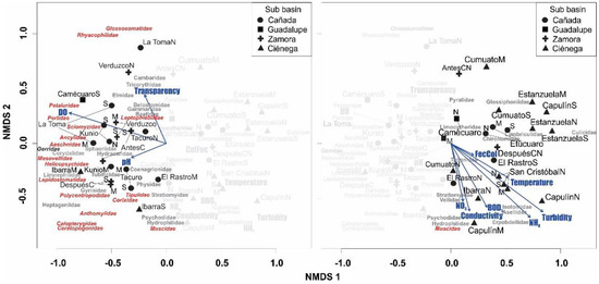 NMDS ordination axes 1 and 2 of the Duero River, including sampling sites within sub-basins, macroinvertebrates families, and environmental variables (stress = 0.14). The same plot is divided into two parts to describe a trend from good (left) to poor (right) conditions. After the site’s name, the capital letter represents the season (M = May, S = September, and N = November). AntesC = Antes Central de Abastos and DespuésC = Después Central de Abastos. DO = Dissolved Oxygen, FecCol = Fecal Coliforms. Family names in red have high bioindication values (6 to 9), and those in gray have low values (3 to 5).