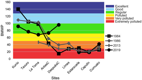 The water, habitat, and biological quality described by the different indices during the dry season are presented in Table 4. No sites showed good conditions, and most were regular, but two were extremely polluted. Regarding the water quality variables, the BMWP had a positive correlation with dissolved oxygen (Spearman = 0.87, p = 0.00001) and a negative correlation with temperature (Spearman = −0.6, p = 0.02), conductivity (Spearman = −0.57, p = 0.03), and ammonium (Spearman = −0.64, p = 0.01). In the correlation of the BMWP with the biological indices, we found positive correlation with the EPT (Spearman = 0.67, p = 0.008) and the Hill numbers of Shannon’s entropy index (Spearman = 0.88, p = 0.00001) and the inverse of Simpson’s index (Spearman = 0.88, p = 0.00001). When we compared the historical BMWP values to try to identify changes over time, the analysis did not show a statistically significant difference among the years (χ2 = 7.54, p = 0.11). However, when plotting the values at the different sites, sites at the origin of the river tended to decrease their water quality in recent years (Figure 4).