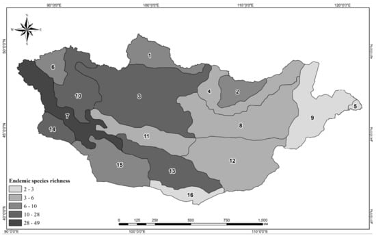 Richness of endemic taxa among the phytogeographical regions of Mongolia. 1–Khuvsgul, 2–Khentei, 3–Khangai, 4–Mongolian Dauria, 5–Foothills of Great Khyangan, 6–Khovd, 7–Mongolian Altai, 8–Middle Khalkh, 9–East Mongolia, 10–Depression of Great Lakes, 11–Valley of Lakes, 12–East Gobi, 13–Gobi Altai, 14–Dzungarian Gobi, 15–Transaltai Gobi, 16—Alashan Gobi.