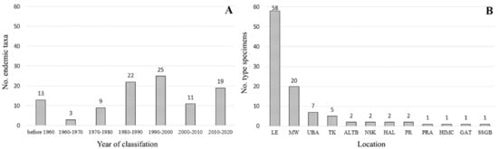 The number of endemic species reported from Mongolia has also varied over the past decades. For example, 47 endemic taxa were reported between 1980 and 2000, and 28 taxa have been reported since 2010 (Figure 2A). Furthermore, most of the taxa’s type specimens, including holotype, paratype, and isotype specimens, were accessioned at LE and MW herbaria (Figure 2B).