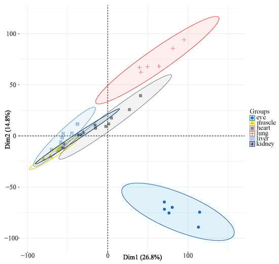 A total of 13,605 orthologous genes were identified by BLASTP. WGCNA and gene expression analysis were based on these orthologous genes. We first performed principal component analysis (PCA) to assess differences in expression between the eyes and other tissues. Results revealed that the 36 samples could be assigned to six groups, according to tissue types, and the first two PCs explained 41.6% of the variance (Figure 3). The same tissues from all six individuals clustered together, indicating that the transcriptome data could be used for further analysis. Furthermore, the eyes were well distinguished, suggesting differences in the expression patterns between eyes and other tissues.