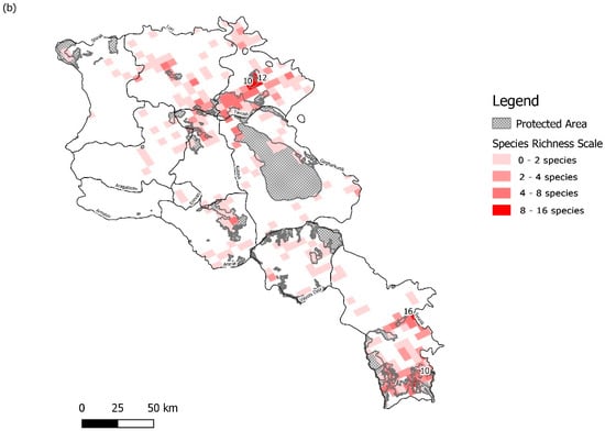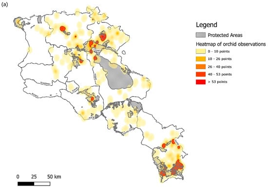 Map showing (a) a heatmap of orchid observations (genera distribution can be found in Figure S1: Map of genera distribution) and (b) species richness within the territory of Armenia, derived from herbarium vouchers, field visits and GBIF records (1101 total data points). Heat map developed using the Kernel Density Estimation with a radial distance buffer of 5 km is graded from yellow to red showing increasing observational findings. Location of Protected Areas derived from the World Database of Protected Areas is also mapped across the study site for comparison.