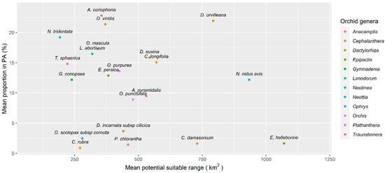 Scatterplot showing species potential climatic suitability range (km2) against the mean proportion of species range within a PA represented as a percentage. Colors represent genera according to the World Checklist of Vascular Plants.