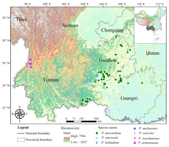 Paphiopedilum is a genus of flagship orchids and comprises some of the most popular orchids due to their beauty and rarity [29]. They are mainly distributed in areas from tropical Asia to the Pacific islands, with some species extending to subtropical areas [13]. Among them, southwest China is one of the distribution centers for this genus. Furthermore, the subgenus Brachypetalum is considered to be the more primitive type of the genus Paphiopedilum. In addition, the threatening situations of the subgenus Brachypetalum species are highly prevalent, such as Paphiopedilum armeniacum [30,31] and Paphiopedilum micranthum [32]. The problems of habitat fragmentation, unreasonable mining, and population decline of the Brachypetalum subgenus group are very prominent. We investigated seven species of the subgenus Brachypetalum that occurred in the wild of southwest China in this study. These species are Paphiopedilum micranthum, P. emersonii, P. bellatulum, P. malipoense, P. concolor, P. wenshanense, and P. armeniacum. In addition, because of the great ecological variation of Paphiopedilum malipoense, three varieties (Paphiopedilum malipoense var. jackii, Paphiopedilum malipoense var. hiepii, and Paphiopedilum malipoense var. angustatum) were classified as the protospecies of Paphiopedilum malipoense. According to the latest published version of The National Key Protected Wild Plants List [33], all these species were national first-class protected species, except for Paphiopedilum micranthum, which was placed on the second-class protected species list. For more detailed information on these species, please refer to Table 1. The scientific names of these species are consistent with the modern international databases (https://www.catalogueoflife.org/, accessed on 6 November 2021).