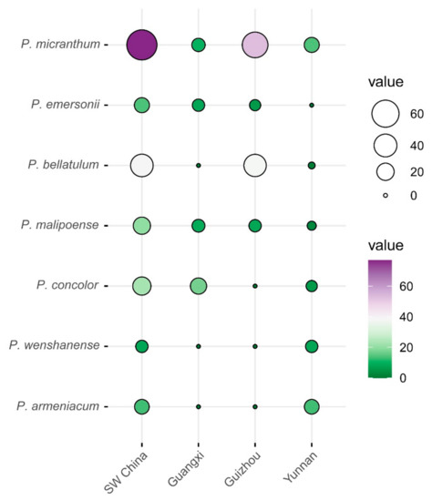 The number of distribution sites detected in southwest China and different provinces for orchids in the subgenus of Brachypetalum.