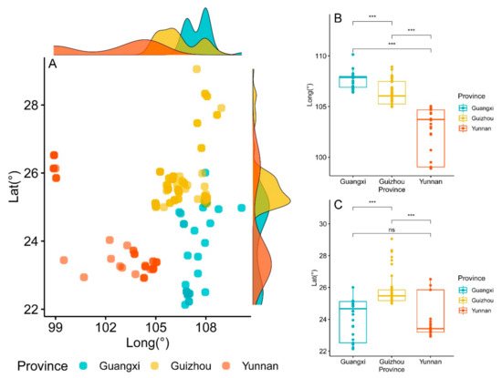 Distribution of all orchids in the subgenus of Brachypetalum and the differences of longitude and latitude in different provinces. (A) Distribution of all orchids in the subgenus of Brachypetalum in Guangxi, Guizhou, and Yunnan provinces. The lines on the top and right are density curves. (B) The longitude differences in the distribution of orchids in the subgenus of Brachypetalum in Guangxi, Guizhou, and Yunnan provinces. (C) The latitude differences in the distribution of orchids in the subgenus of Brachypetalum in Guangxi, Guizhou, and Yunnan provinces. Note: ns represents not significant; *** represents 0.001 level of significance.
